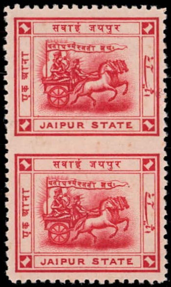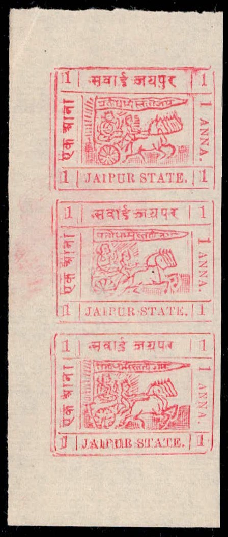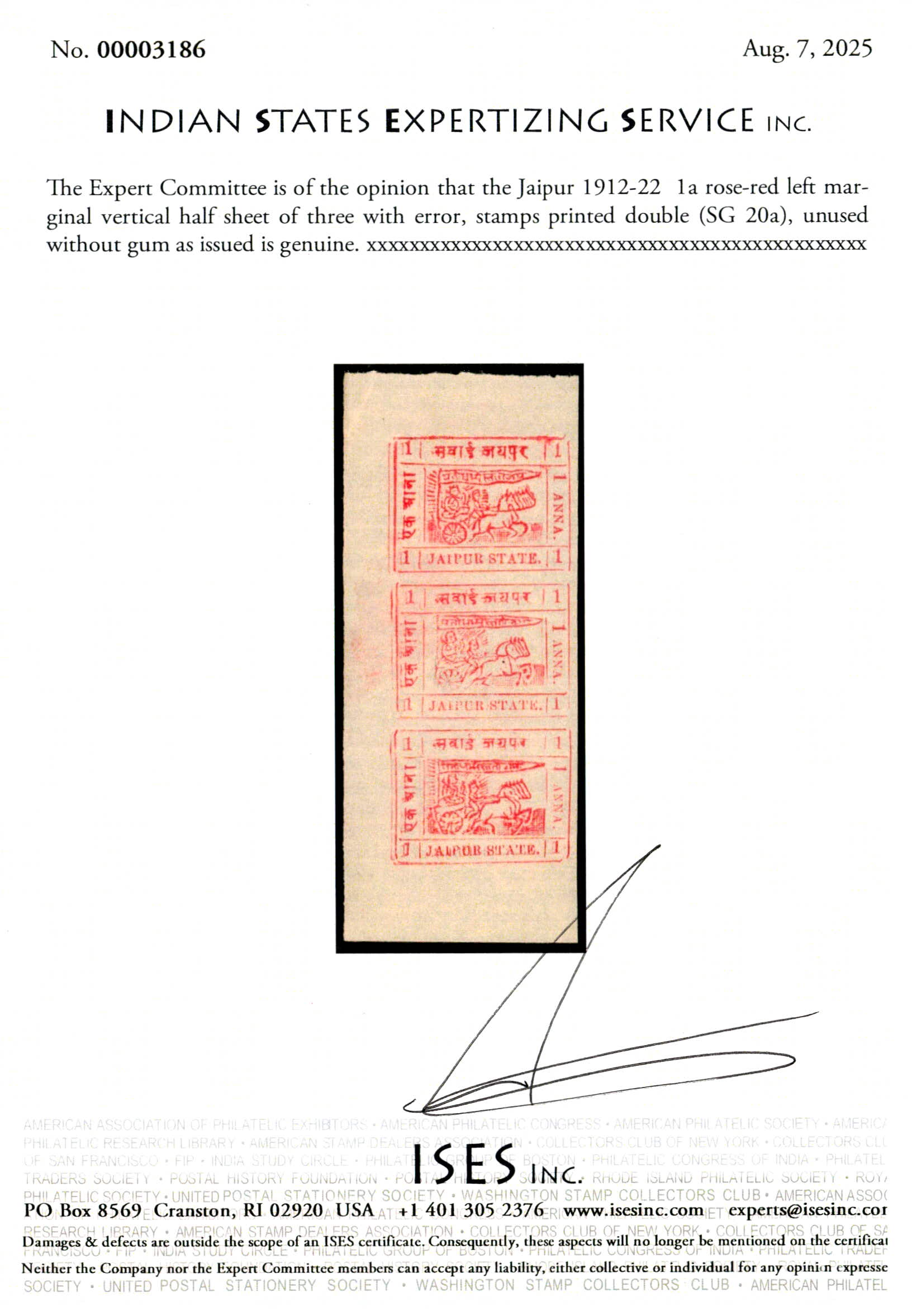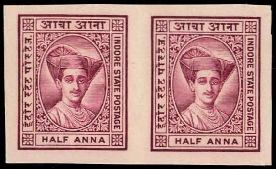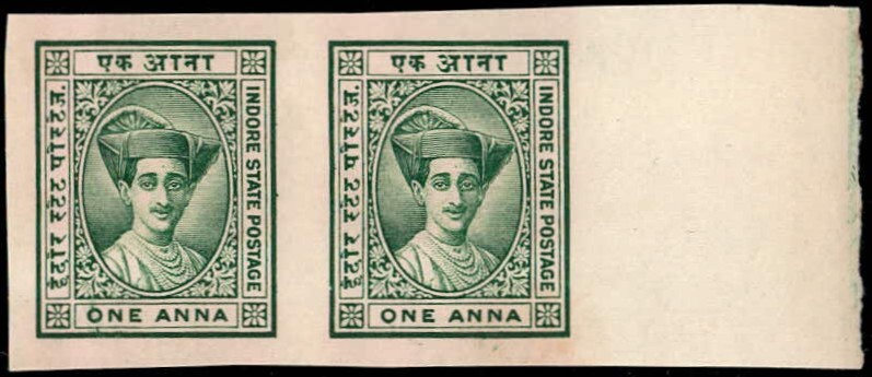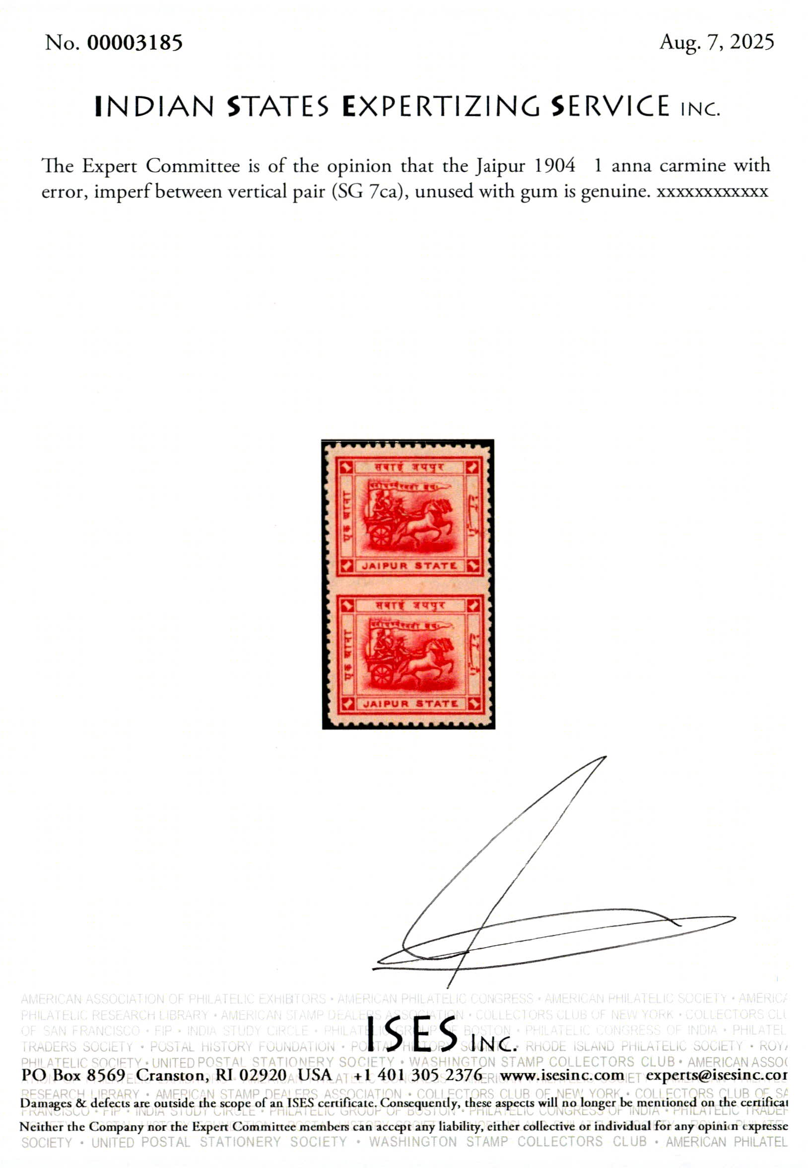 1904 1 anna carmine with error, imperf between vertical pair. 2025 ISES certificate.
