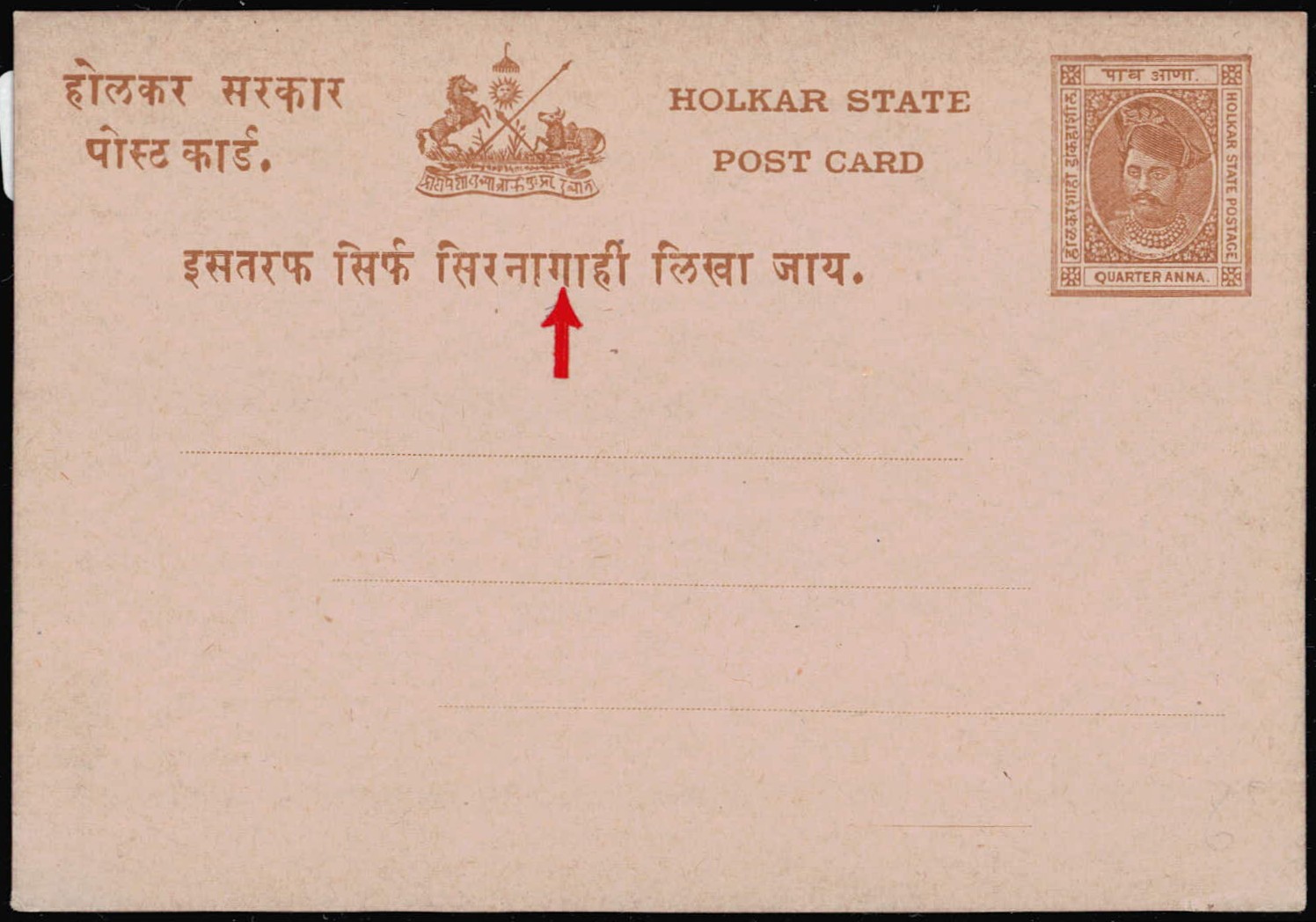 1938 ½a black & violet surcharged PAV ANNA in Devanagri in red used on local postcard tied by Jaipur 7 March 1939 cds.