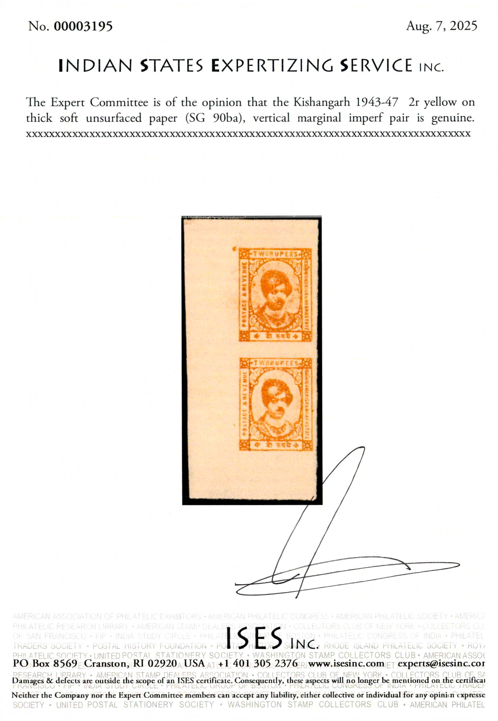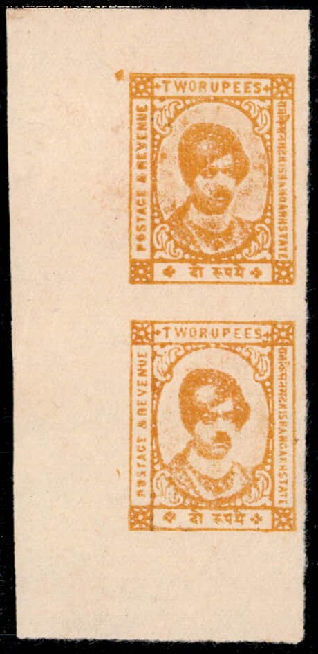 1943-47 2r yellow on thick soft unsurfaced paper, vertical marginal imperf pair. 2025 ISES certificate