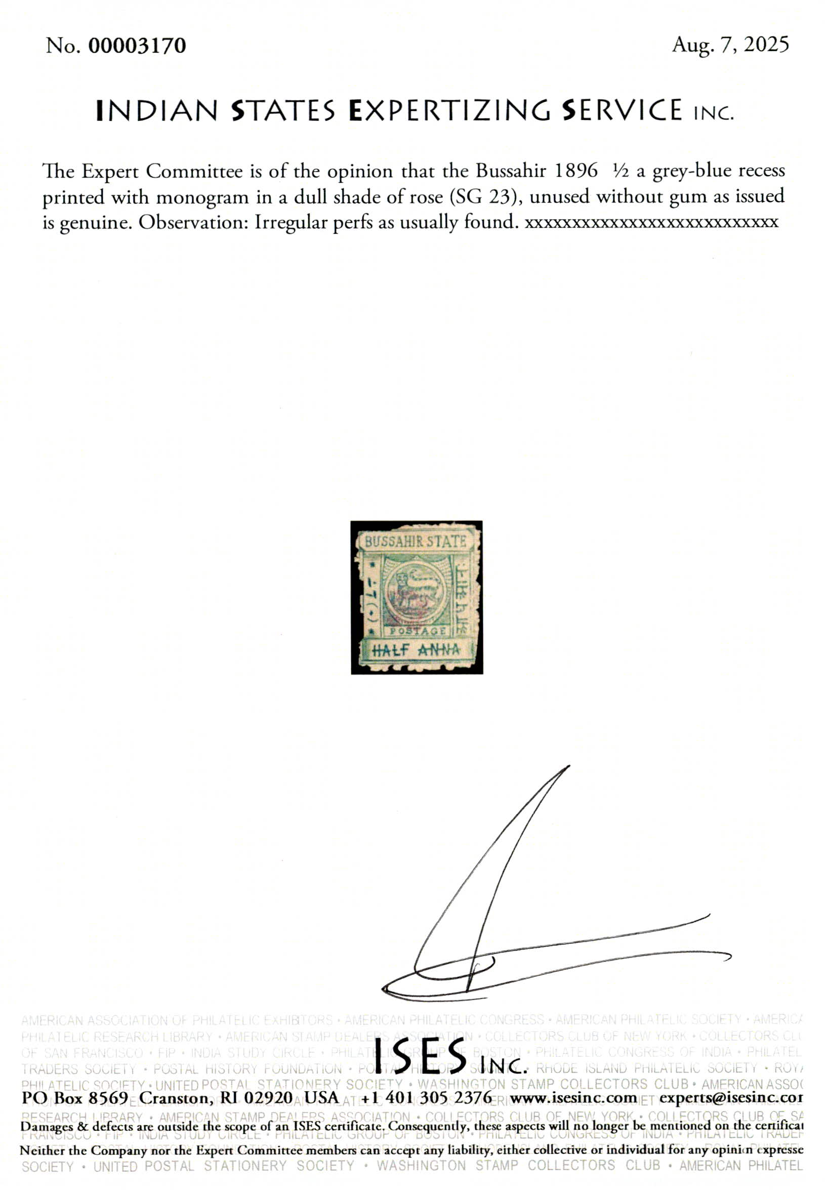1896 ½ a grey-blue recess printed with monogram in a dull shade of rose. Unused without gum as issued. Irregular perfs as always found. 2025 ISES certificate