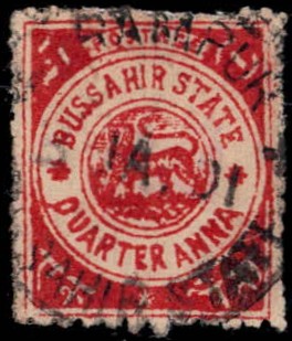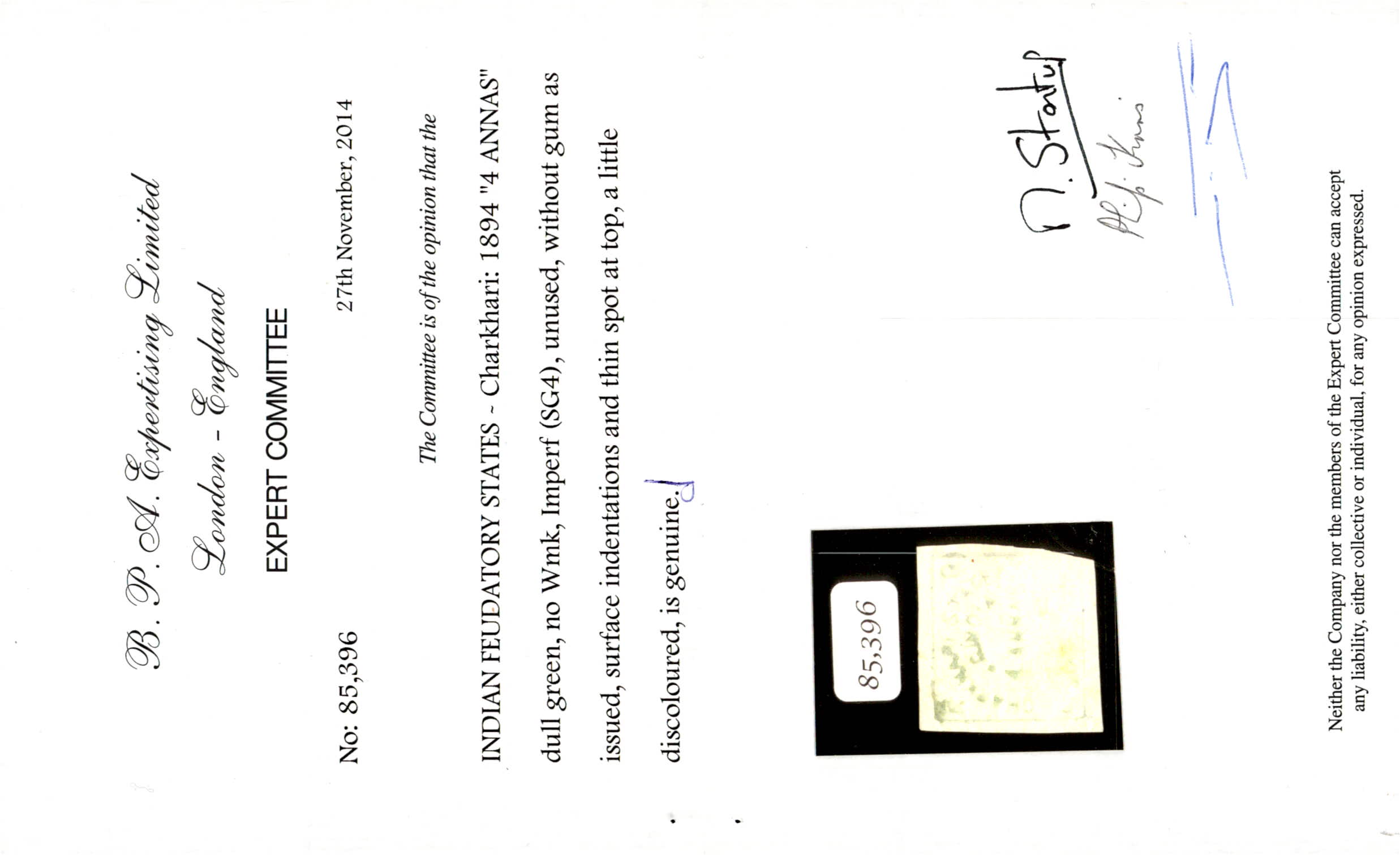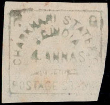 1894 "4 ANNAS" dull green imperf unused without gum as issued. Minor thin spot and a little discolored but a rare stamp nevertheless. 2014 BPA certificate