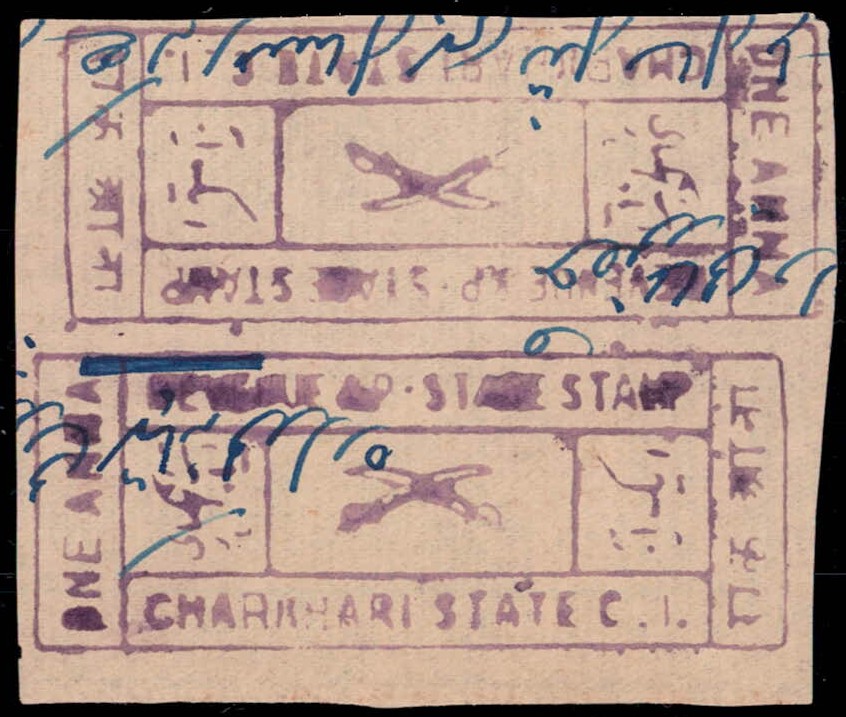 1921 1a violet on vertical laid paper vertical pair with error, stamps tete-beche. This error not previously recorded. With pen cancel suggesting fiscal usage.
