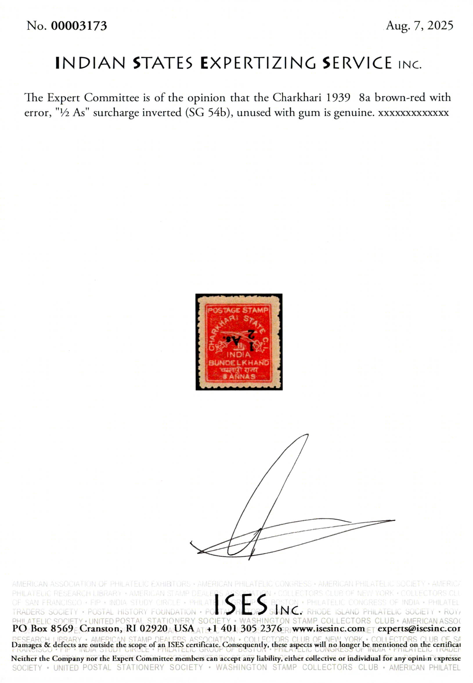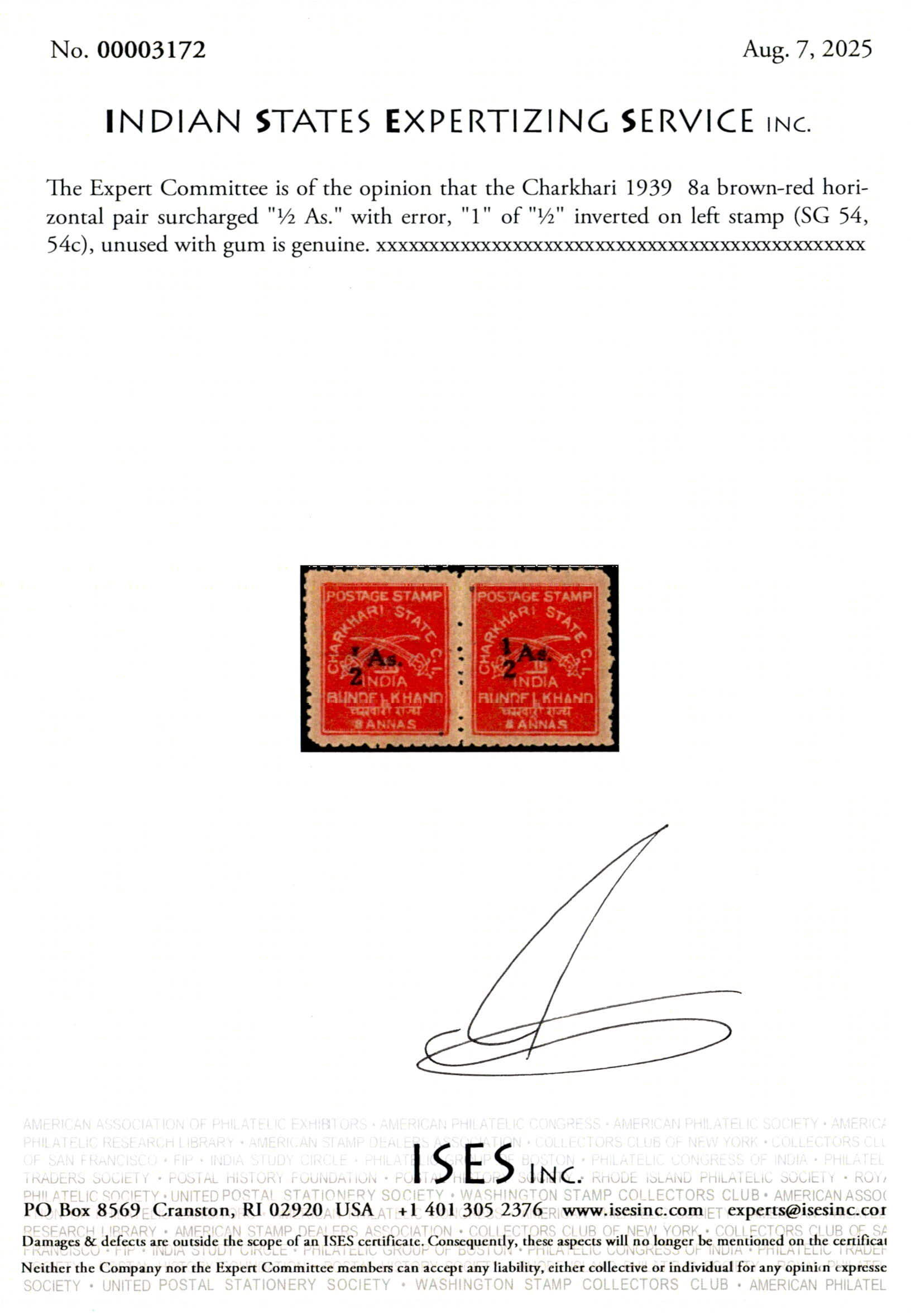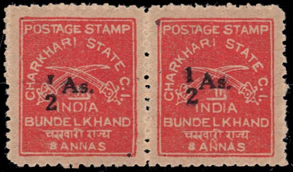 1939 8a brown-red horizontal pair surcharged "½ As." with error, "1" of "½" inverted on left stamp. Stamp with error is never hinged. 2025 ISES certificate