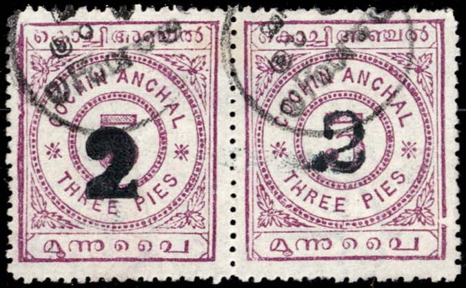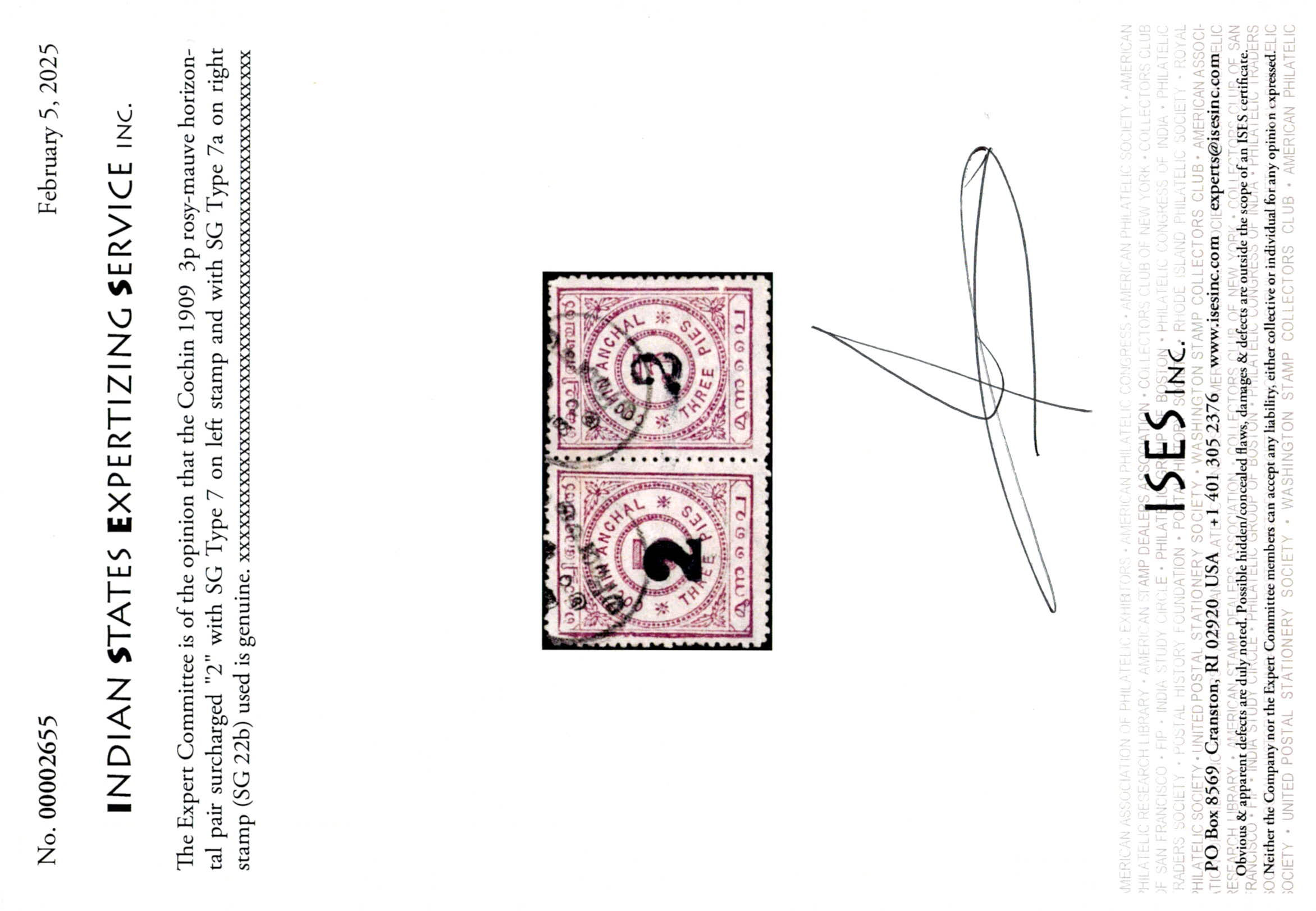 1909 3p rosy-mauve horizontal pair surcharged "2" with SG Type 7 on left stamp and with SG Type 7a on right stamp. This is one of only two recorded used se-tenant pairs with both types of surcharges. Catalog value as single stamp £950; worth several times as a se-tenant pair. 2025 ISES certificate