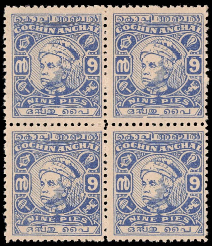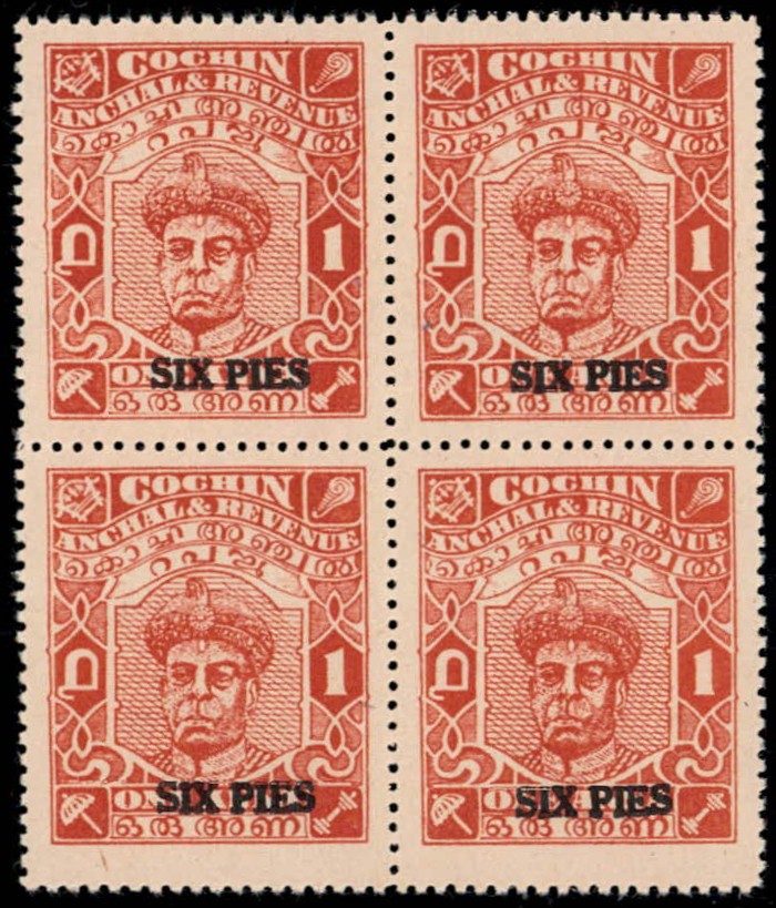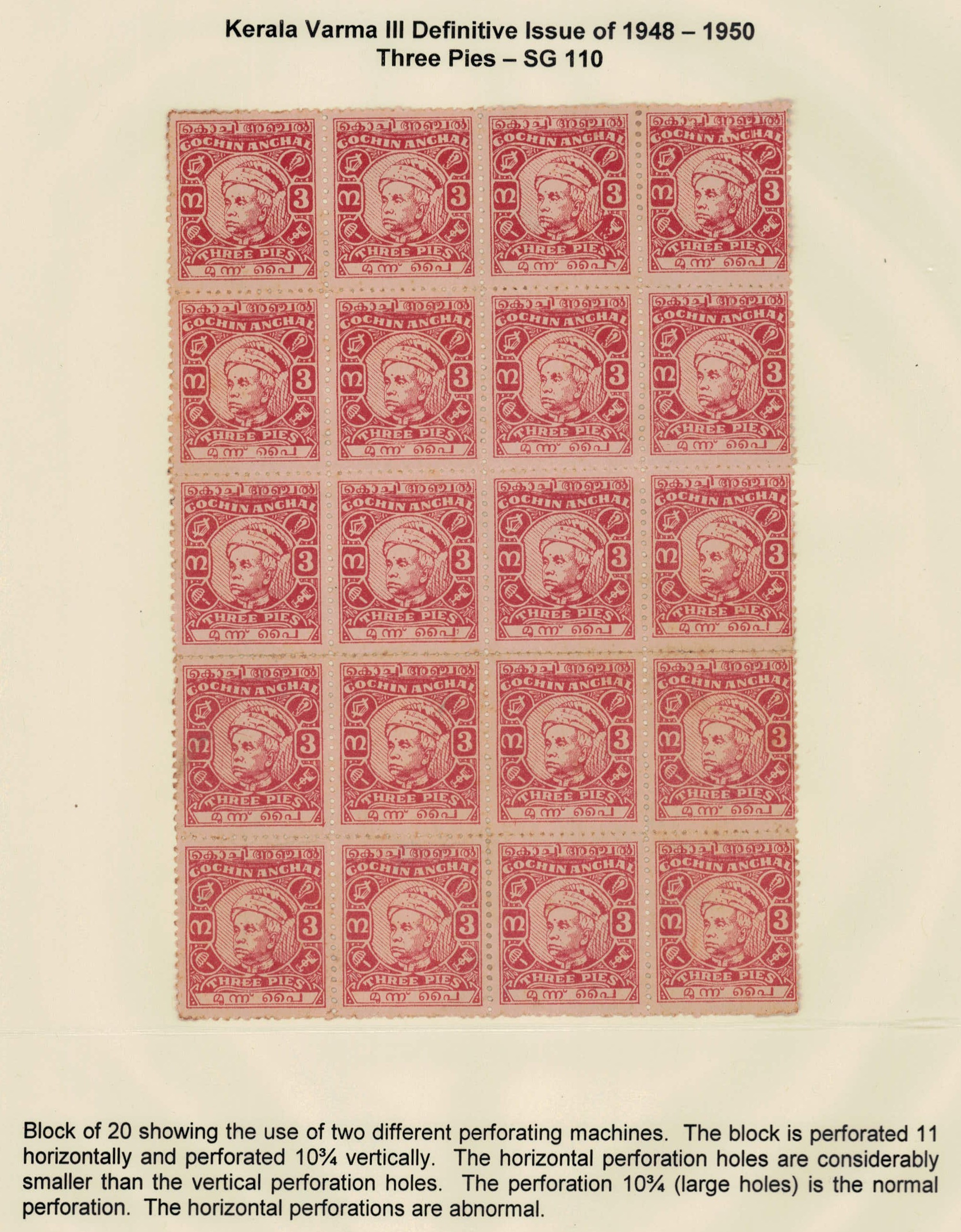 1948-50 3p block of 20 showing the use of two different perforating machines; perf. 11 horizontally and perf. 10¾ vertically. It should be noted that the 10¾ was the normal perforation; the horizontal perforations are abnormal. Unused without gum as issued