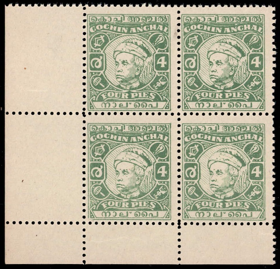 1948-49 4p green corner marginal block of 4. Unused without gum as issued