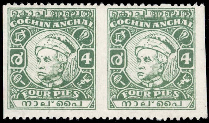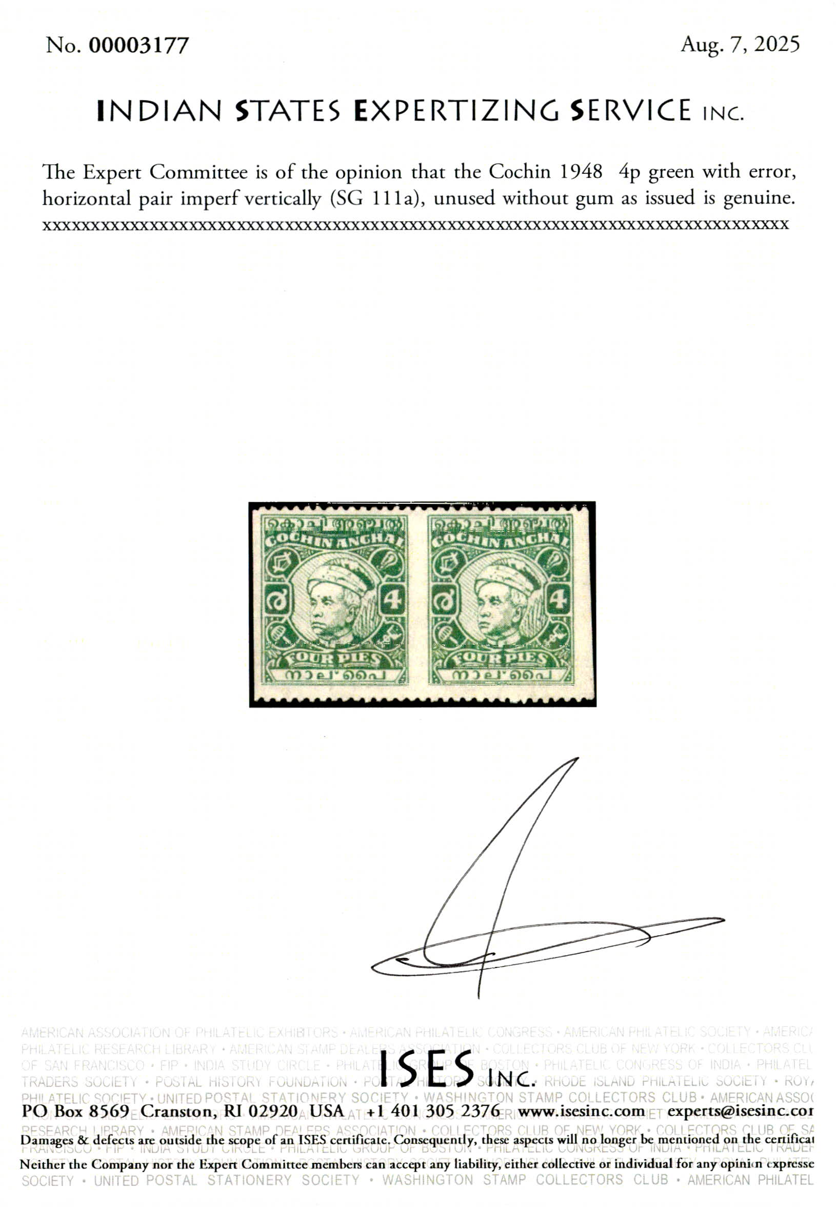 1948 4p green with error, horizontal pair imperf vertically. Unused without gum as issued. 2025 ISES certificate