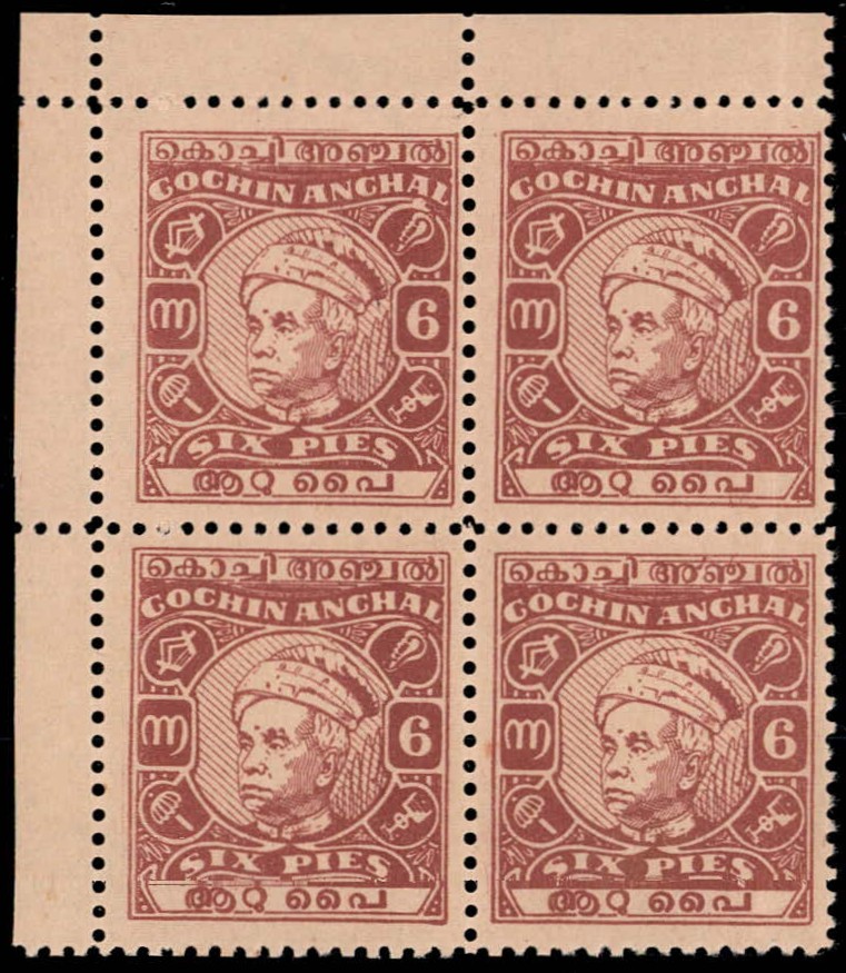 1948-49 6p chestnut corner marginal block of 4. Unused without gum as issued