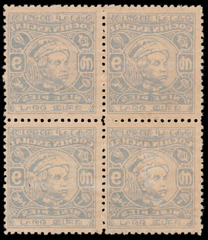 1948-49 9p ultramarine block of 4 with error, complete offset on reverse. Unused without gum as issued
