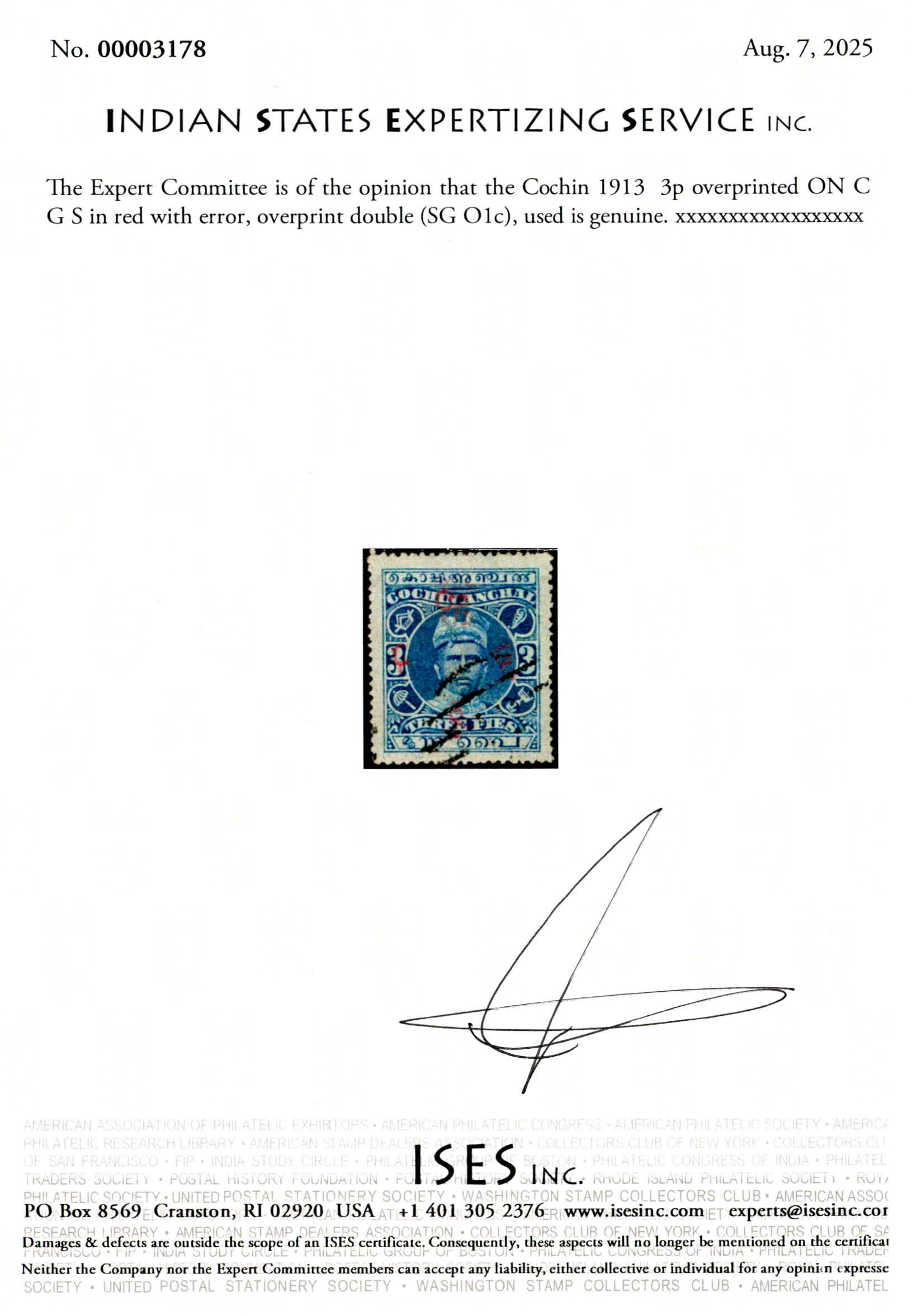 1913 3p overprinted ON C G S in red with error, overprint double. A great rarity. 2025 ISES certificate.