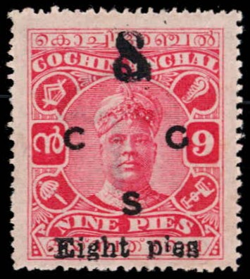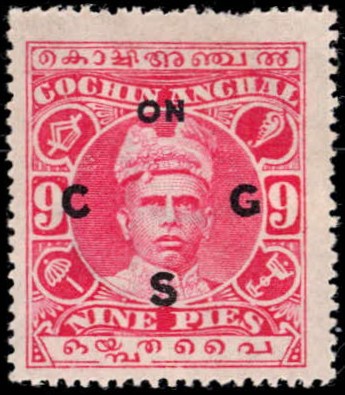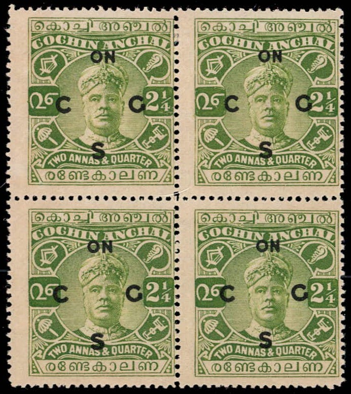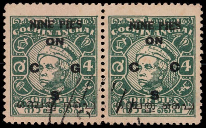 1949 9p on 4p overprinted ON C G S, horizontal pair, left stamp with "C" for "G" error.