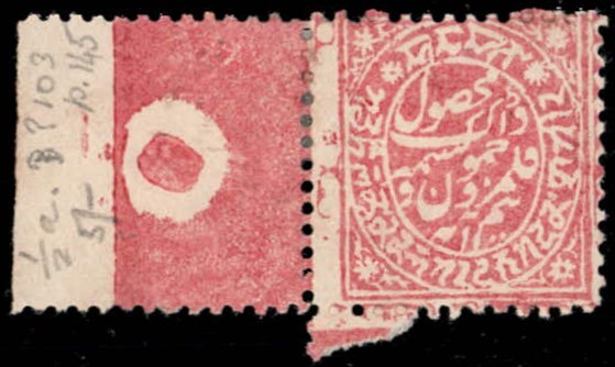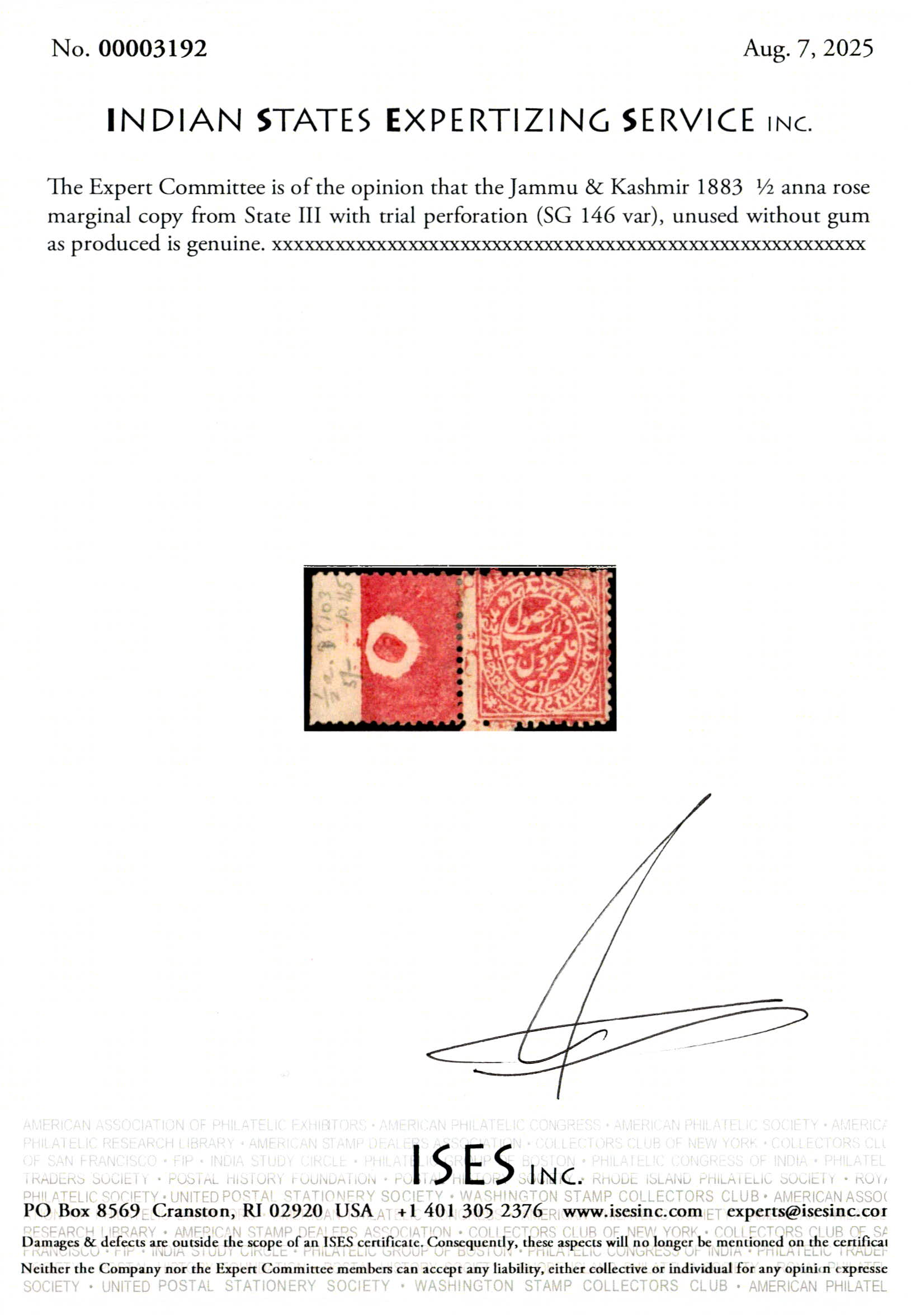 1883 ½ anna rose marginal copy from State III with trial perforation. Unused without gum as produced. 2025 ISES certificate.