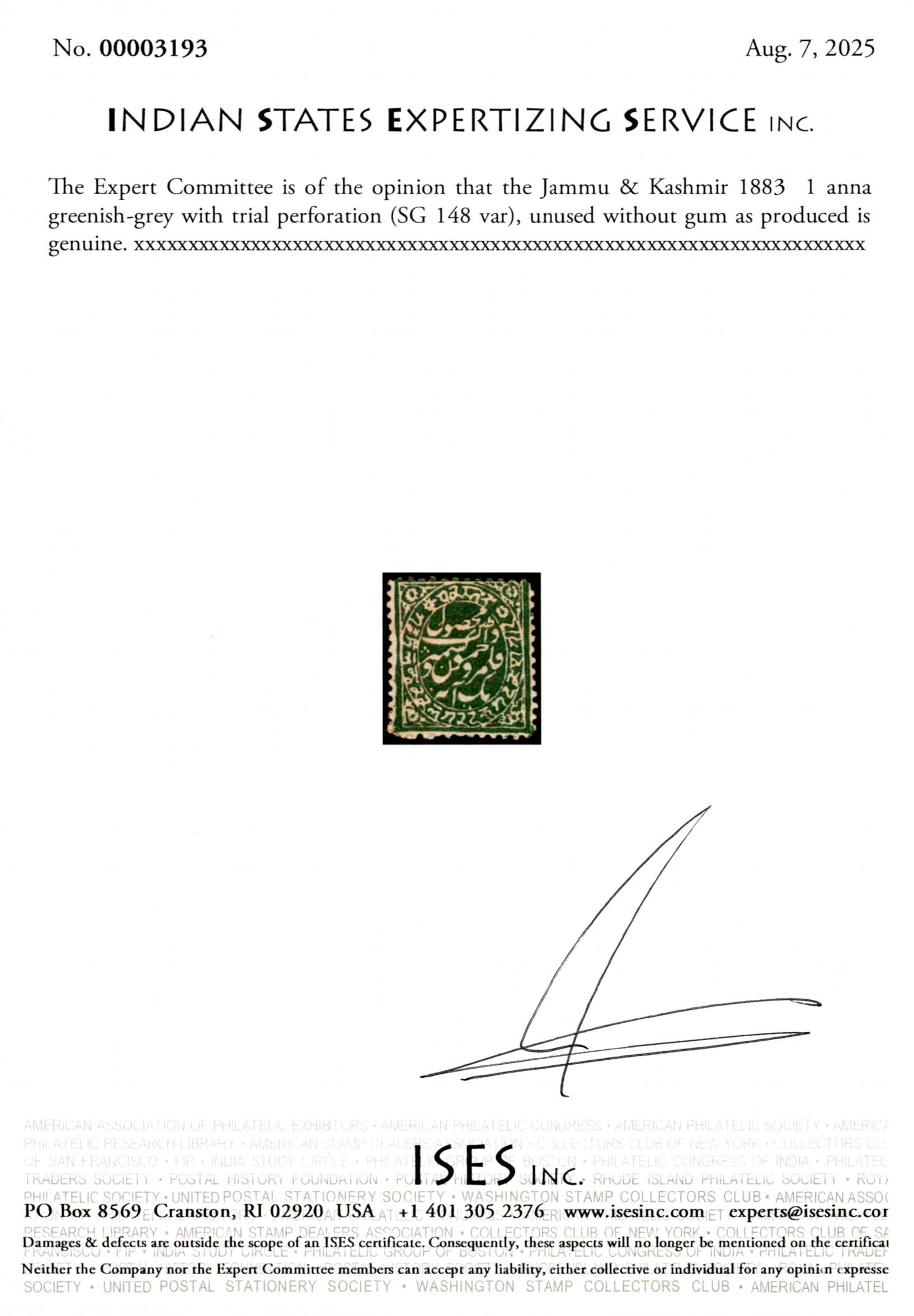 1883 1 anna greenish-grey with trial perforation. Unused without gum as produced. 2025 ISES certificate.