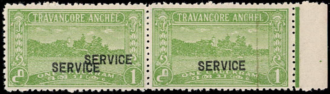 1941-42 1ch horizontal marginal pair overprinted SERVICE with error, overprint double on left stamp. Unused without gum as issued.