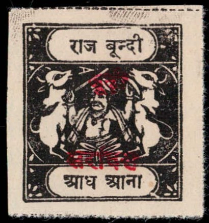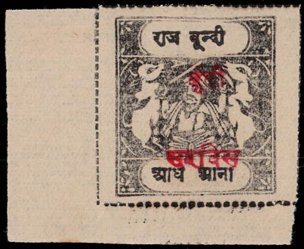 1915-41 ½a black on horizontally laid paper overprinted Bundi Service in Devanagri in red. Unused without gum as issued.