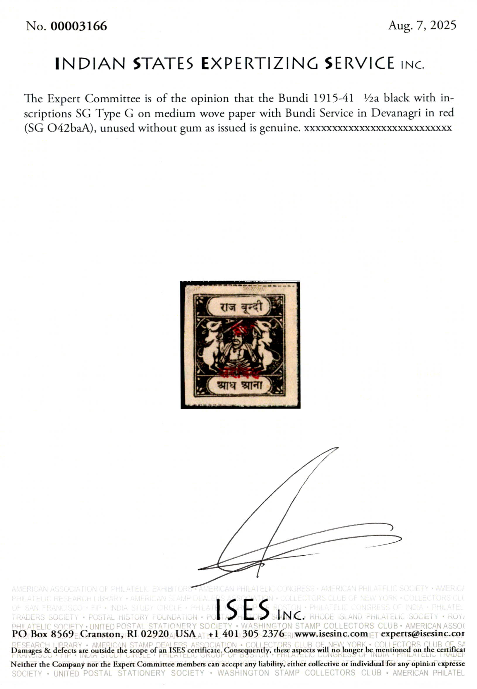1915-41 ½a black with inscriptions SG Type G on medium wove paper with Bundi Service in Devanagri in red. Unused without gum as issued. 2025 ISES certificate