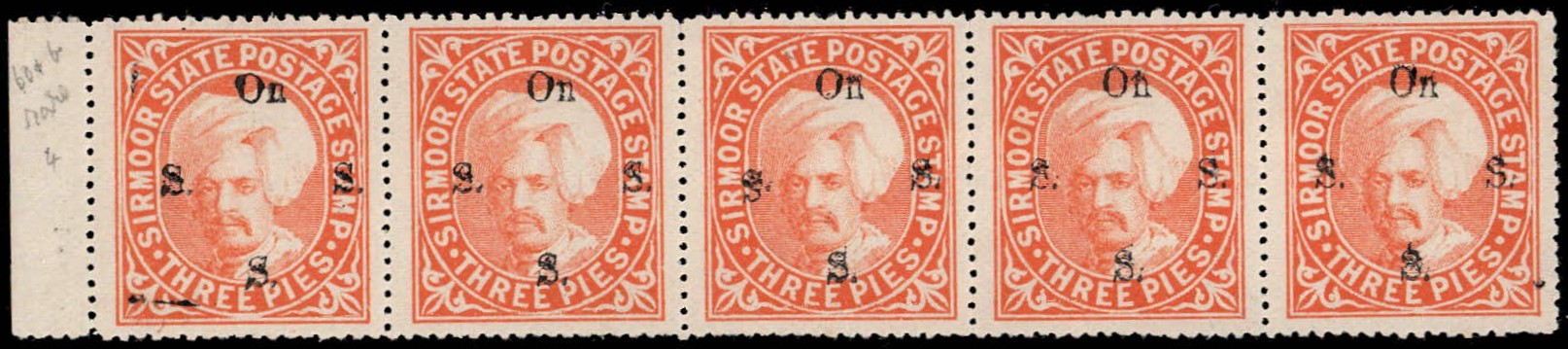 1894-99 3p orange vertical strip of five overprinted On S S S with SG Type 13 with error, overprint inverted. (see footnote in SG after SG 107). These overprints were made for collectors. 2025 ISES certificate