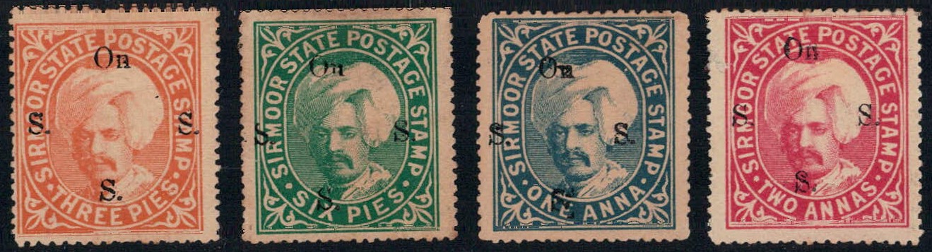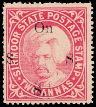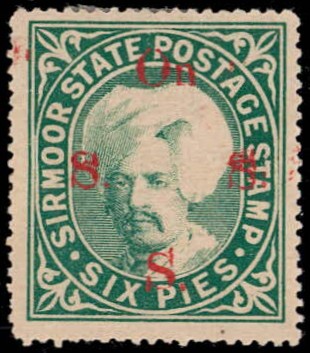 1892-97 6p green with double On S S S overprint in red, once with Type 12 and once with Type 13. While this stamp is known in vertical se-tenant pair with Type 12 & 13 overprint, this is the first example we can seen with both Types of overprint on the same stamp. A spectacular rarity of Sirmoor. 2025 ISES certificate.