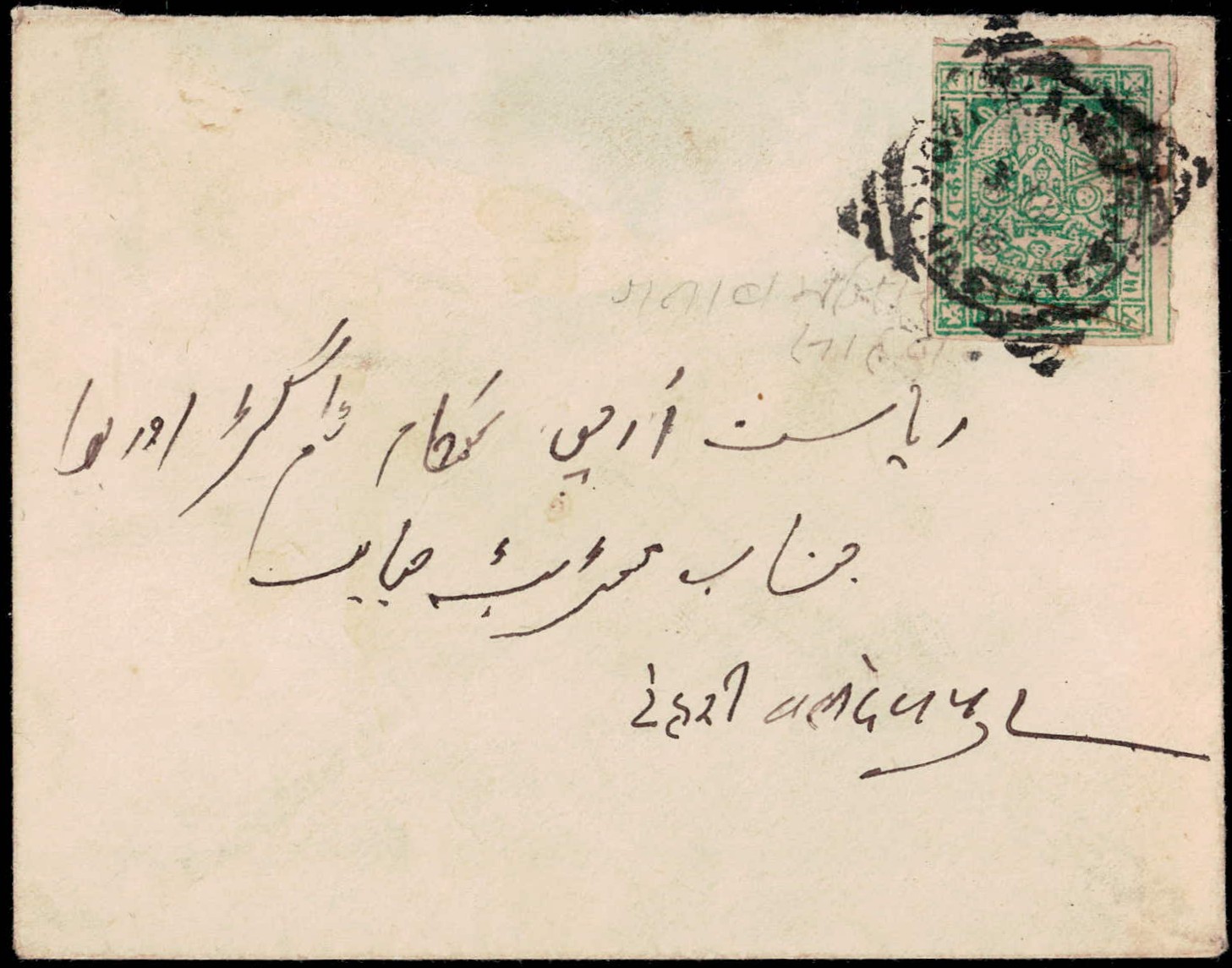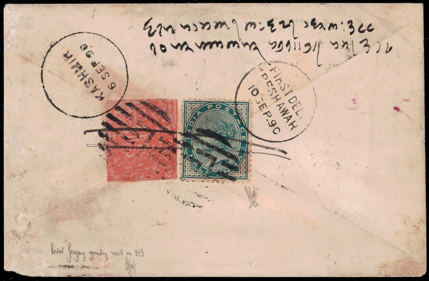 1890 combination cover from Kashmir to Peshawar (Pakistan) franked with India QV ½a green additionally franked with a "Postal Forgery" copy of the ½a orange in watercolor tiled by "L" in barred circle cancel with KASHMIR / 6 SEP 90" dispatch cds and "FIRST DELY / PESHAWAR / 10 SEP 90" delivery cds. A rare usage of a postal forgery stamp produced to defraud the State.