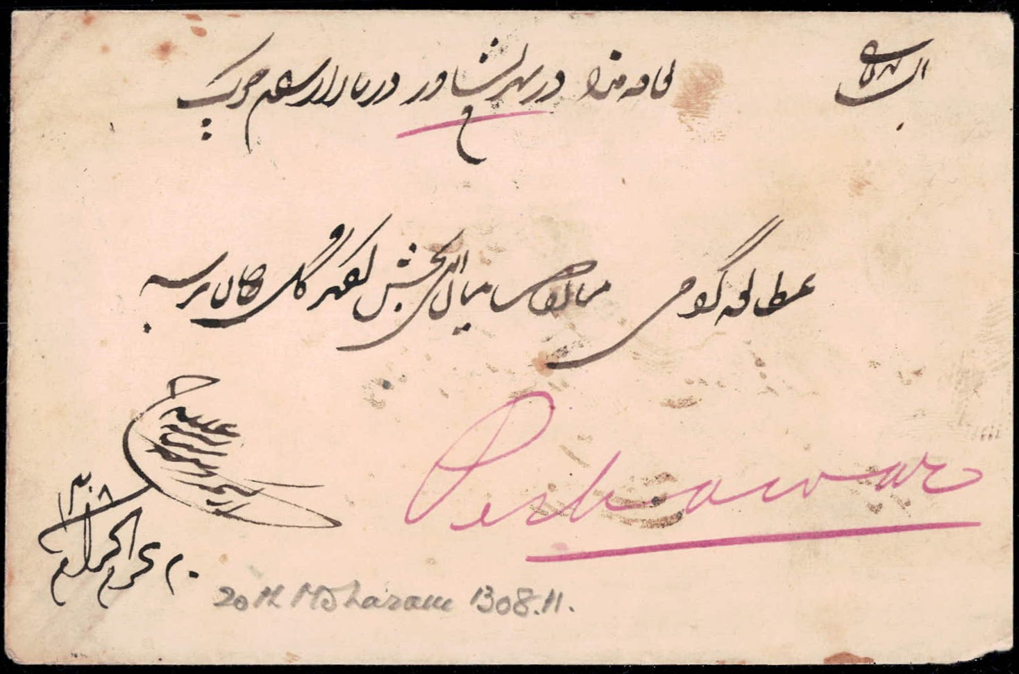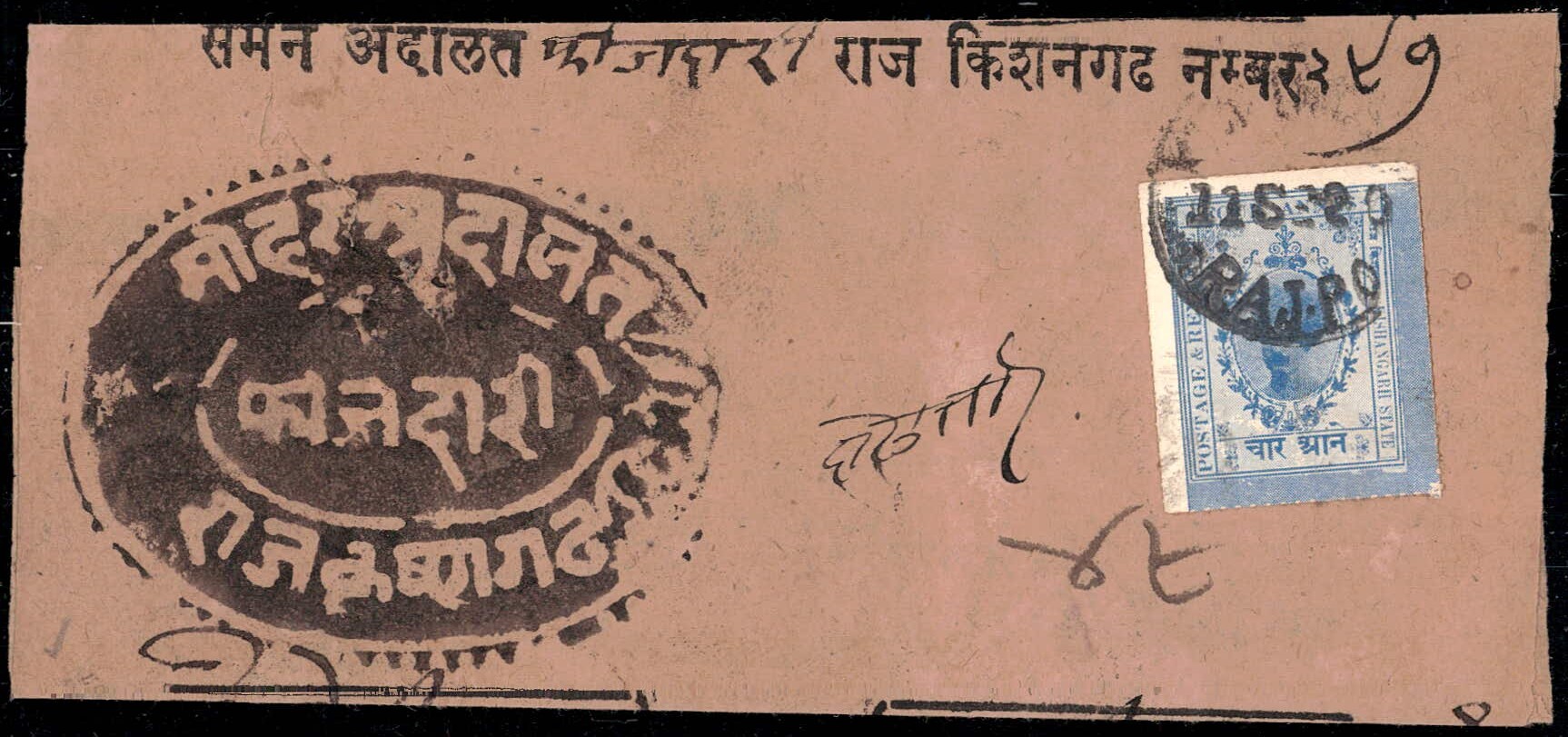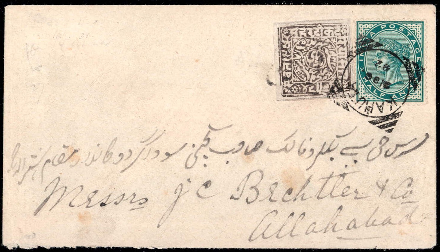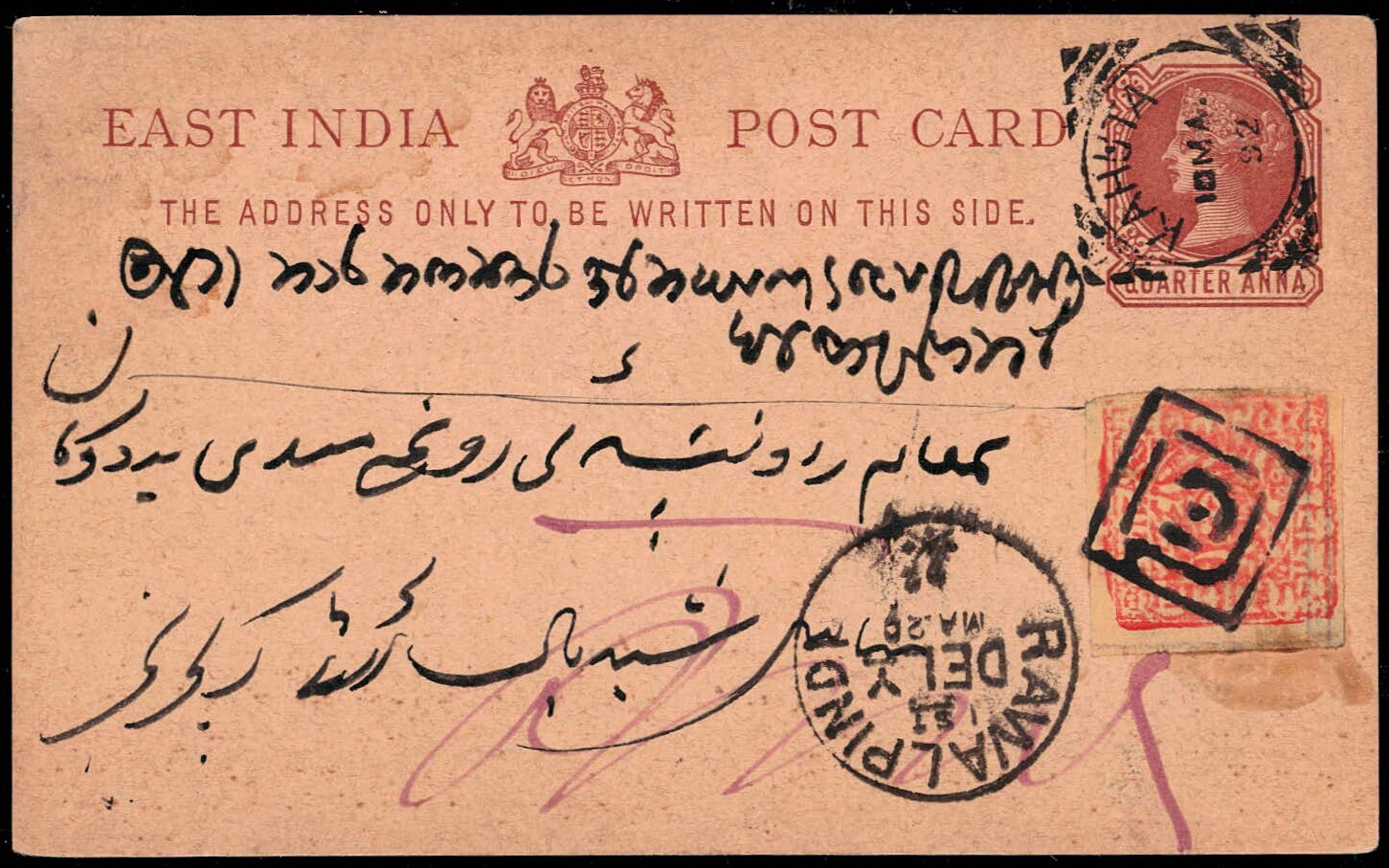 India ¼a QV postal stationery postcard from Poonch to Kashmir additionally franked with Poonch 1887 1p red on blue wove batonne paper tied by "KAHUTA / JL 26 / 94" squared circle Imperial exchange office cancel with Jammu Imperial delivery cds and Jammu & Kashmir State delivery cds dated 29 July 1894. It is interesting to note that while the Jammu & Kashmir State post delivered this postcard to the addressee, the recipient was not charged State postage because of a reciprocal agreement between the two States allowing the delivery of each other's mail without requiring payment of incoming State postage.