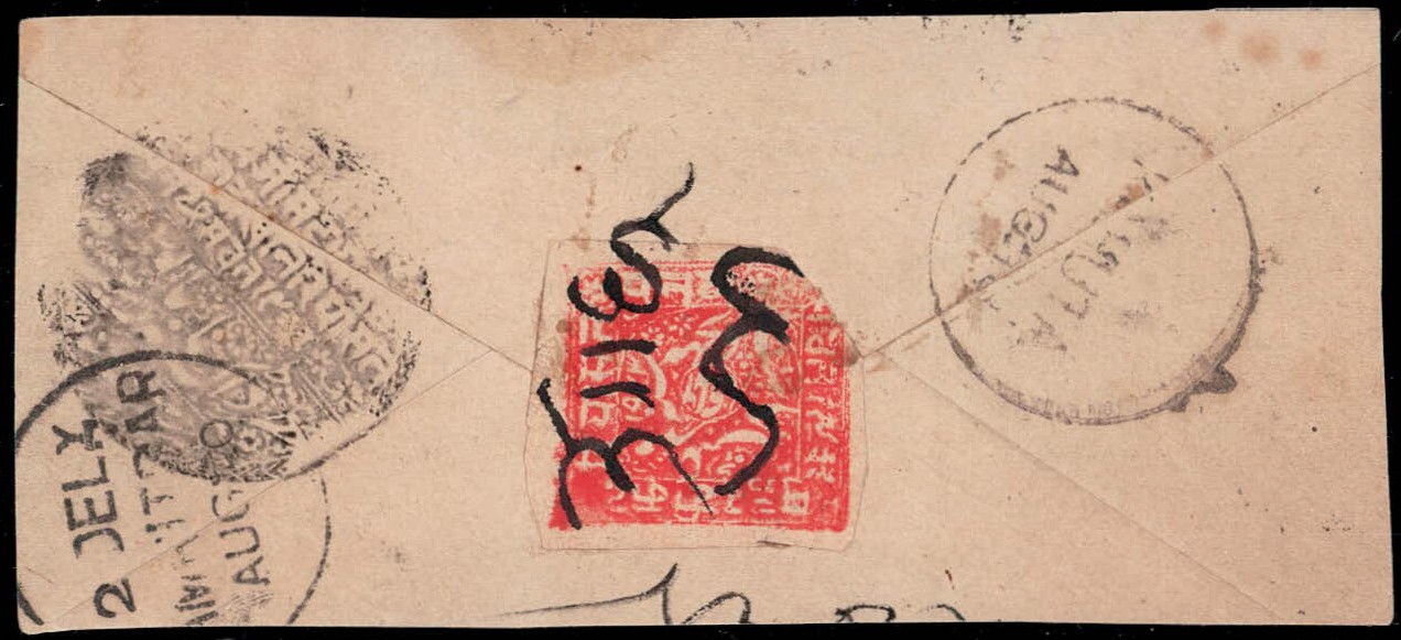 1876 6p red on yellowish white wove paper used on part cover tied by manuscript cancel, stamp with corner missing, with Poonch native 4 line intaglio seal cancel, Kahuta transit cds and Amritsar delivery cds. Catalog value of stamp alone is £300